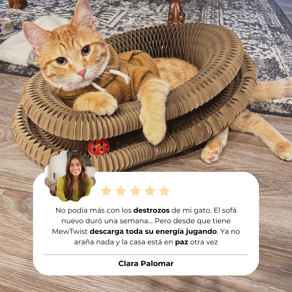 Mika se aburría cuando se quedaba sola y terminaba arañando el sofá. Con el juguete interactivo canaliza su energía rascando y persiguiendo la pelota.